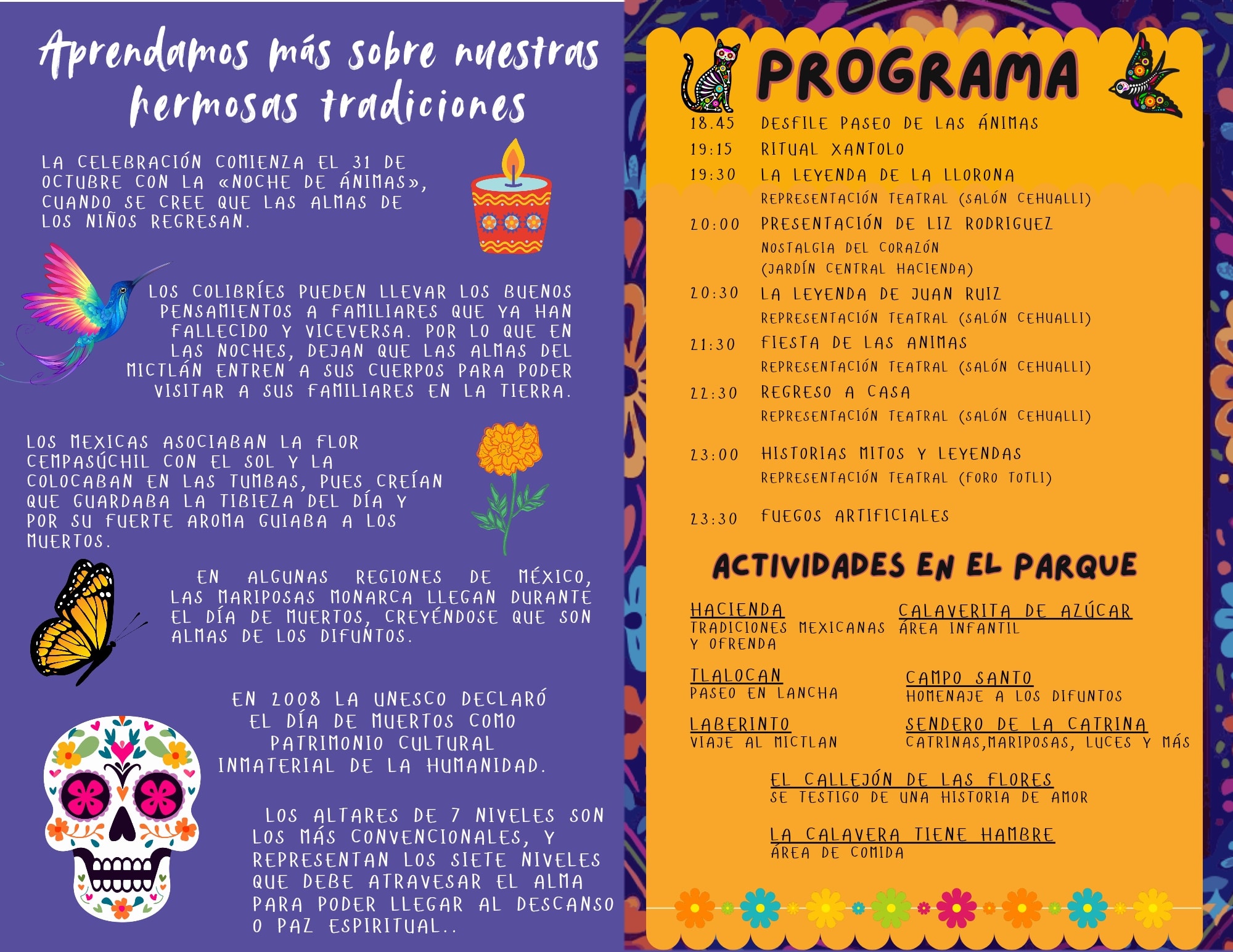 Desde las 6 pm empezará el evento. A las 7:30 pm se presentará la primera obra teatral de cinco en total. Podrás disfrutar simultáneamente de actividades en el parque como visitar diferentes ofrendas, paseo en lancha, realizar el laberinto, conciertos en vivo, disfrutar de catrinas, luces, un área de comida con música DJ en vivo y cerraremos la noche con fuegos artificiales.